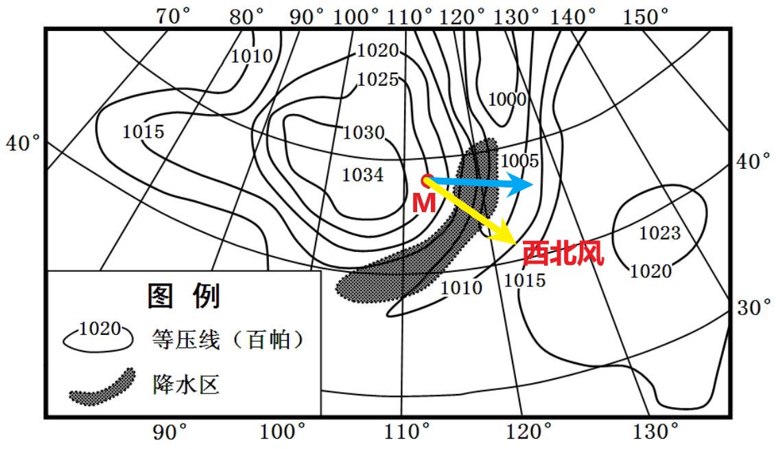 精讲精析:(1)分析M地的风向。①由图中的等压线可以看出,中间气压高、四周气压低,因此为反气旋(高压中心);②由图中的纬线可以看出从南向北,纬度逐渐增大(由30°增大为40°),因此为北半球;③风向由高压指向低压,并向右偏转(北半球向右偏转),因此为西风+向右偏转(向南偏转),即为西北风。