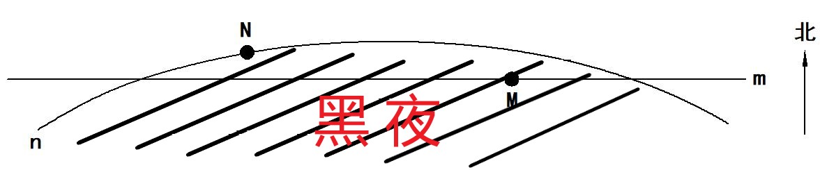 (2)分析此时的季节。①由题干可知,N地看到日落,因此N地位于昏线,即N地左侧(西侧)为白天,右侧(东侧)为黑夜,如下图所示;②北极点位于晨昏线的北侧,此时为白天,即北极点为极昼,因此此时为北半球的夏半年(春分-夏至-秋分)。