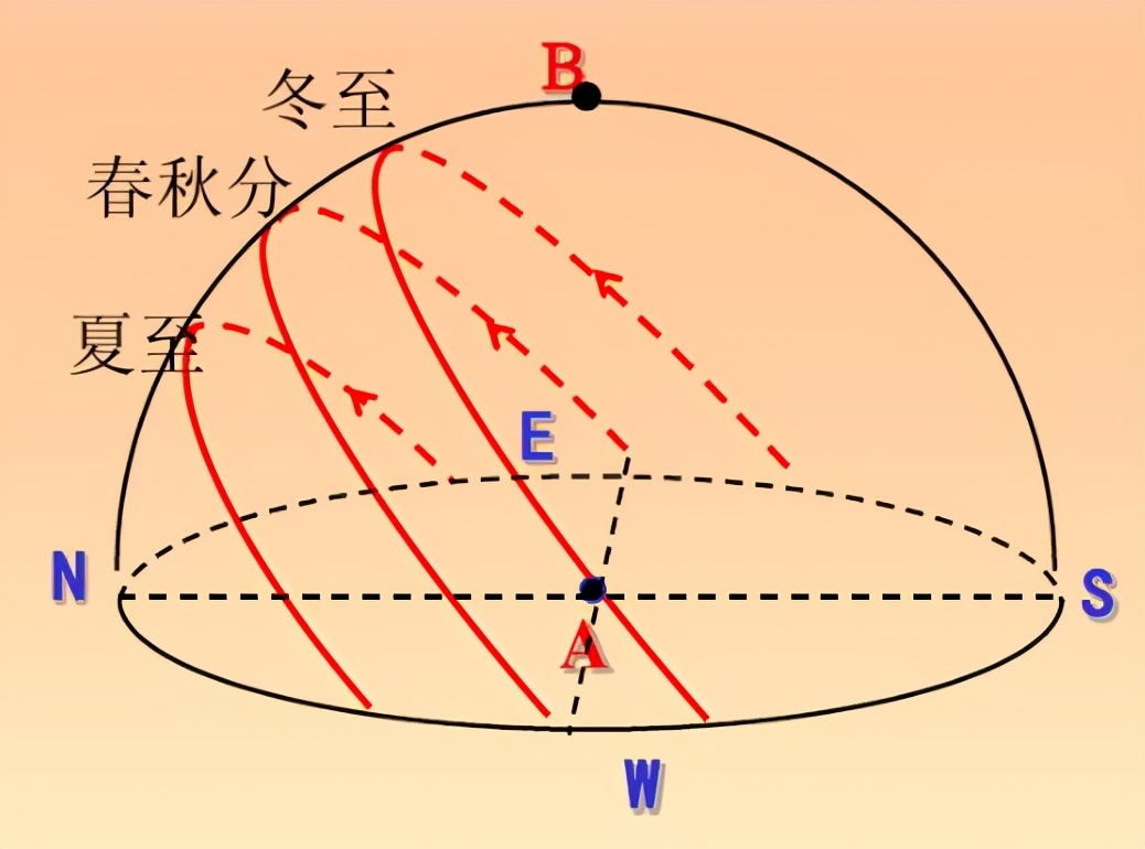 ①A位于北半球,则运动轨迹向南倾斜,日出日落方位如上文所述(与太阳直射点的位置有关);