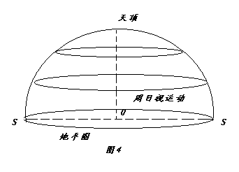 北极,地平面与天轴垂直,此时太阳周日视运动圈与地平面平行,此时太阳始终不升也不落。并且太阳高度保持不变,而且始终在正南方向。(图4)
