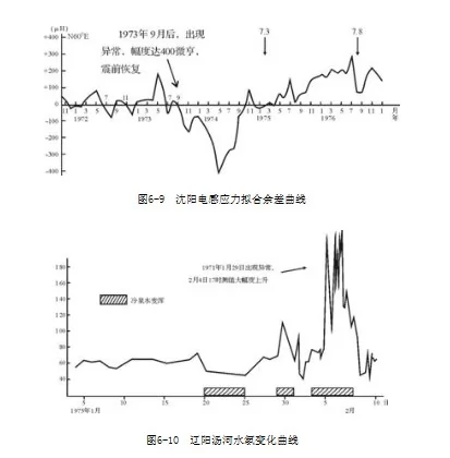图6-6是辽宁南部垂直形变图,它是根据长水准复测资料勾画的高程变化等值线图。在这张图上,一根曲线上每一点的高程变化都是相等的,所注数字就是这根线上各点的高程变化值,单位为毫米。由图可见,营口—海城一带与周围,尤其是与辽宁南部相比,上升要小得多,或者说,是相对下沉区。金县短水准从1973年9月开始上升,1974年6月至8月反向,9月至11月又加速上升,12月再次缓慢下降,直到发震,呈现明显的阶段性(图6-7)。营口的地倾斜从1973年下半年开始上升,与金县短水准大体同步,超过均方差22倍(图6-8)。图6-9和图6-10分别给出沈阳电感应力与辽阳汤河水氡变化曲线,也都存在明显异常。