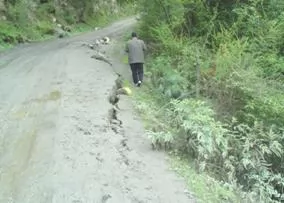 上面举的这些例子说到的地裂缝都是构造地裂缝,它们是这些强震的地震断层在地表的反映,不受地形的影响。有时还可看到另一类受地形、土质等局部因素影响的非构造裂缝。它们大多沿山坡边缘、河岸边坡、或古河道展布。图4-2是2003年8月18日西藏波密南5.7级地震时,在公路边沿的山坡出现的地裂缝。该地裂缝距震中30千米,在Ⅵ度区,是地震时出现的,但它受地形控制,由地震与重力共同作用形成。