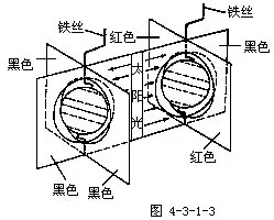 3.取两块厚硬纸板,中间对称地画上太阳的一部分及平行的太阳光线,在平行光线上分别加一红色箭头,外侧分别涂上黑色。然后用刀在两块厚硬纸板上分别刻出比乒乓球直径略大的圆孔(图4-3-1-2)。再取两块同样大小的硬纸板,中间刻出同样直径的圆分别在其正面和背面涂上红色与黑色。