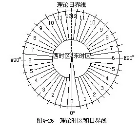 为了使时间计量满足社会发展的需要,建立适应国际交往日益频繁的时间计量系统,而又避免全球用同一的时刻造成的麻烦,1884年在华盛顿举行的国际经度会议上,确定了以平太阳时为基础的标准时制度。这种标准时制度规定,按经度线把全球划分成24个标准时区。每个时区跨经度15°,在此范围内,使用统一的标准时间。位于每个时区中央的那条经线,叫做中央经线,它是所在时区的标准经线。中央经线的地方平太阳时,就是该时区的标准时间,也称为区时。本初子午线所在的时区,叫做零时区,也叫做中央时区,简称中区。中央时区的中央经线,是通过格林威治天文台原址的0°经线。0°经线向东、向西各7.5°;即为中时区的范围。从中时区向东,每隔经度15°划为一个时区,依次称为东1区、东2区……,东12区跨经度7.5°(E172.5°至180°);中时区以西,每隔经度15°划为一个时区,依次称为西1区、西2区……,西12区跨经度7.5°(W172.5°至180°)。在中央时区以东(称为东时区)及其以西(称为西时区),实际上都各有十一个半时区,东12区和西12区合起来共跨经度15°,并以180°经线的地方平时,作为它们共同的标准时间(图4-26)。