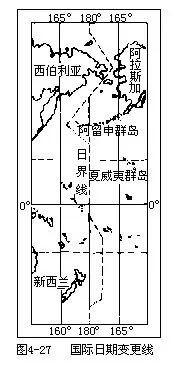 理论上,180°经线是日期变更线。实际上,日期变更线同180°经线并非完全一致。为了使日界线避开大陆和岛屿,保持每个国家在日期上的一致性,经过国际间协商,规定日期变更线以180°经线为基本依据,而在三个地段使日界线偏离180°经线:在俄罗斯西伯利亚的东端向东偏离;在阿留申群岛西部向西偏离;在S5°~S51°30′之间向东偏离。这样构成一条不规则的线,就是目前实际上为世界各国通用的国际日期变更线。