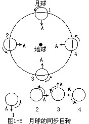 用图1-8可以说明月球的同步自转运动。设A为月面上的一个固定点,月球在1的位置时,它正对着地球。月球绕地球公转到位置2时,A仍然正对着地球。但是,从1到2,A点已经向东转动了90°,即月球公转90°也自转90°。随着月球在公转轨道上位置的不断变化,A一直都对着地球,而它绕月心的旋转也一直在进行。月球运行到位置3时,A已围绕月心旋转了180°。当月球公转一周再回到位置1时,A点也围绕着月心旋转了360°。由于月球不断地进行和公转同步的自转,使A在月球绕地球公转过程中,始终正对着地球。
