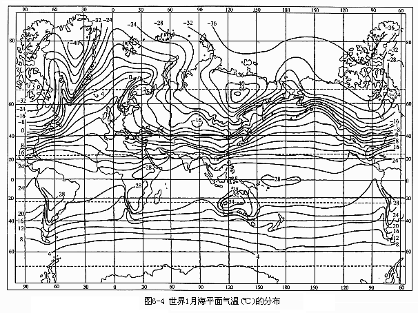 地球表面高低起伏,各气象台站所测的气温是不同海拔高度上的温度。如以这些温度点在世界地图上,将温度相同的点连成等温线的分布图为实际温度分布图。如果将对流层垂直温度梯度平均为0.65℃/100m值对各地的实际温度订正到海平面高度,得到海平面气温,用各地海平面温度绘成的等温线图表示海平面高度的气温的地理分布。图6-4和6-5是世界1、7月海平面气温分布图。实际温度图表示各地的实际温度,对工农业生产有实际价值;海平面温度图是消除高度因素影响的理论温度图,在科学研究中应用。