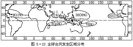 台风大多数发生在南、北纬5°—20°的海水温度较高的洋面上,主要发生在8个海区(图5·22),即北半球的北太平洋西部和东部、北大西洋西部、孟加拉湾和阿拉伯海5个海区,南半球的南太平洋西部、南印度洋西部和东部3个海区。每年发生的台风(包括热带风暴)总数约80次,其中半数以上发生在北太平洋(约占55%),北半球占总数的73%,南半球仅占27%。南大西洋和南太平洋东部没有台风发生。