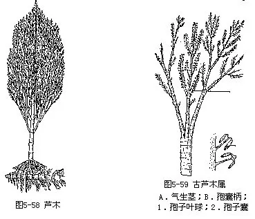 芦木属植物高大(图5-58)。虽然其外貌为乔木状,但其形态结构似现代的木贼属植物,有匍匐的根状茎和直立的气生茎两部分。不定根生在根状茎节上,气生茎高20—30米,分节与节间,节间长3—8米,节中实而节间中空,节间空腔的径达30厘米,节上多分枝。叶细小,轮生在分枝的节上,基部联合成鞘状。茎内有形成层,故有次生构造。孢子叶集生于茎枝顶端,形成孢子叶球;孢子叶球由许多孢囊柄及苞片组成,每个孢囊柄上悬垂2个孢子囊。孢子同型或异型。