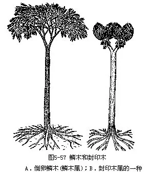 鳞木属和封印木属(图5-57)同属于鳞木目。在泥盆纪已出现,到石炭纪达到了最高度的发展,而在二叠纪时完全消失。除少数为草本外,大多数皆为高大乔木,它们的化石在我国也有较多的发现。