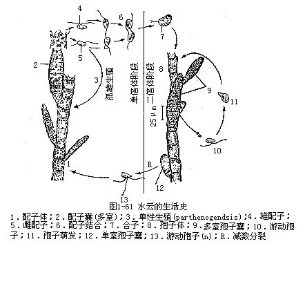 属于等世代纲水云目。在地球上分布较广,有些种分布在寒带的海水中。为小型褐色叉状分枝的丝状体,丝状体是单列细胞,分化成匍匐附着部分和直立部分。匍匐部分的分枝密而不规则。直立部分簇生,末端小枝逐渐变细。细胞单核,有少数带状或多数盘形的载色体(图1-61)。