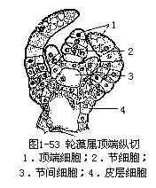 属于轮藻纲轮藻目植物。植物体直立,具分枝,体表常含有钙质,以单列细胞分枝的假根固着于水底淤泥中。主枝分化成节和节间,节的四周轮生有短枝,短枝也分化成节和节间,短枝又被叫做“叶”。无论是主枝或是短枝,顶端都有1个半球形细胞,叫做顶端细胞(apicacell),植物的生长即由顶端细胞不断分裂形成的。顶端细胞横分裂,形成两个子细胞,上面的子细胞继续保持顶端细胞的作用(图1-53)。下面的子细胞再进行一次横分裂,又形成两个子细胞。第二次形成的两个子细胞中,下面的1个不再分裂,长大成节间的中央细胞;上面的1个经过数次纵裂,构成节部,同时,部分细胞发育成包围于间节中央细胞外的皮层。节部细胞短小,节间细胞长管状、多核、载色体多数,具中央大液泡。主枝能无限生长;短枝到一定长度便停止生长,在短枝节上还具有单细胞刺状突起。