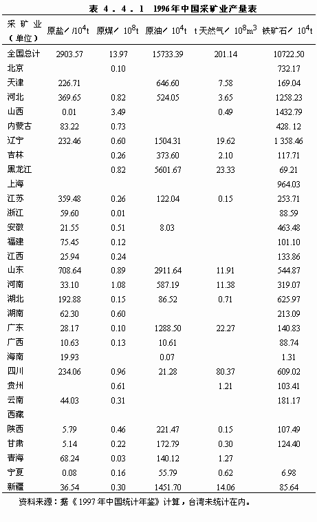 1.重点矿业的布局形成三种类型:①分布广而相对集中型,如煤、铁、铜、磷等矿种的开采。其中煤炭产量的41.77%集中在黄河中游地区,仅山西一省就占全国26.13%;生铁相对集中在华北环渤海区、黄河中游区和东北区,三者合占全国59.44%。②分布较广而相对集中型,如铝土、钨、锑、石棉等;③分布范围小而高度集中型,如石油和天然气、钾盐、金刚石、菱镁矿、稀土、镍等。石油高度集中在东北和华北环渤海区以及西北区,东北区即占全国50.9%,仅黑龙江省就占到全国38.34%;天然气高度集中在西南、东北和华北环渤海区,三者合占全国74.05%,仅四川就占43.76%。这种集中布局的矿业有利于集中开发,形成矿产资源区域开发的各具特色和区域间的分工协作。但由于矿产资源分布不平衡,必然造成某些消费量大的矿产资源在大范围内过远运输,加重交通运输的压力,造成矿业开采区与消费区的空间脱离。