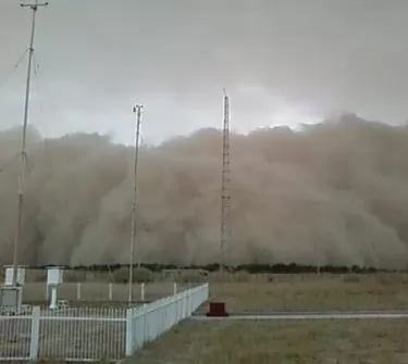 据中国气象报报道,受高空槽影响,5月14日19时54分,一股强沙尘暴如同滚滚黑烟自西南方向向东北方向袭击了青海省格尔木地区。最小能见度为200米,最大风速达每秒22.3米,白昼立即变成“黑夜”。