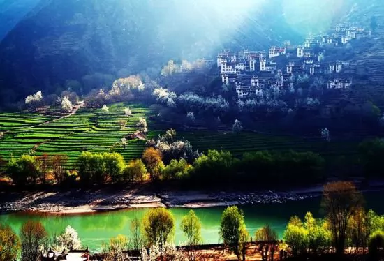 丹巴山寨是嘉绒藏寨中最具特色的。尤以甲居、聂呷、革什扎和巴底乡最为突出,几百幢民居依山就势、错落有致地融于自然环境中,体现了天人合一的理念。远远看去,充满灵气的山谷中,翡翠般的青草绿树之中,是那沉甸甸的田地和隐在密林深处的寨房,伴着时有时无的潺潺溪流,一幅富有动感的绝妙山寨画卷随之展示在你的眼前。