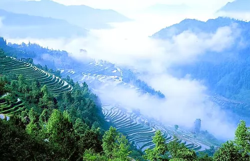 夏天,到处是一片青葱稻浪,如一条条绿色彩带迎风飘扬。金秋十月,由于海拔高低不同,同处于一座山坡的梯田,黄色由浅变深,形态各异,共同组成了一幅幅精美的图画。冬季,注水的梯田中夹杂着一些收割禾穗后的金色糯禾稻草和一些绿色的绿肥地,连同散落于田间宁静的苗家吊脚楼,又构成了一幅幅美丽的中国山水画。