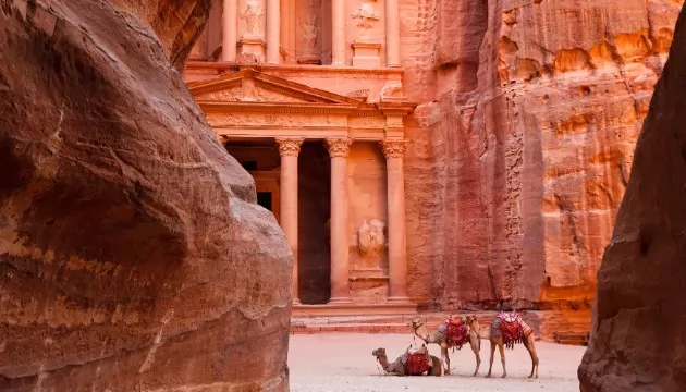 佩特拉古城位于死海和红海之间的战略要地,自公元前6世纪起就是纳巴泰王国的首都。后来该城被罗马帝国占据,公元2世纪时,一次毁灭性的地震使其先进的供水系统瘫痪,城市就此被遗弃。这座沙漠古城以玫瑰红色的石灰石建造而成,至今仍然是世界上最重要的考古点之一。