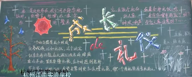看得出出黑板报的同学是个很有美术潜质的人。这期板报可圈可点的地方很多,报头文字设计得成熟老道,文字部分也写得非常漂亮,插图符合主题,画得不错。问题是文字太空,内容不够详实,整体感觉有点单薄。希望下次能有更多同学参与其中,让黑板报更加充实。